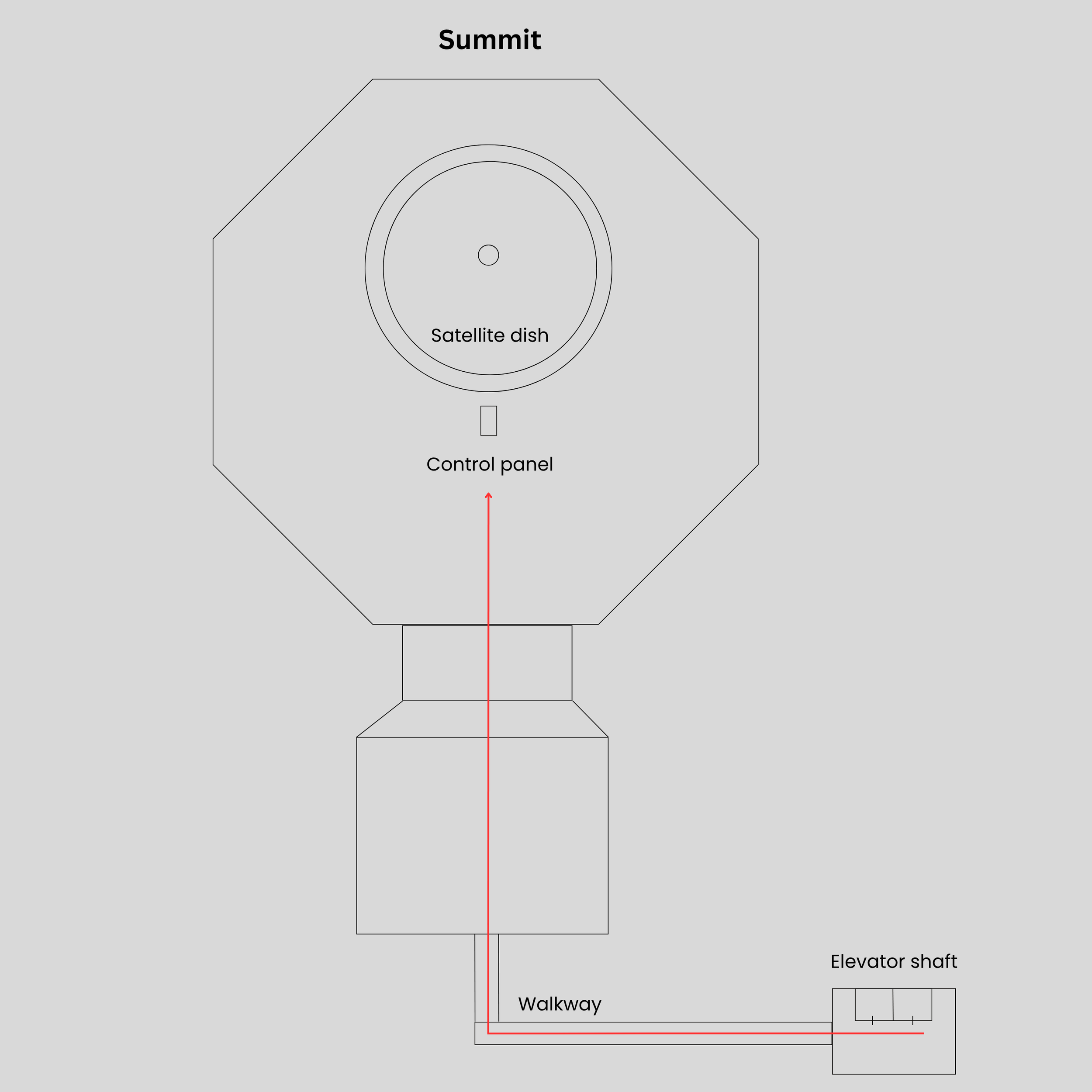 • Player reaches the summit after scaling up the elevator shaft and travelling along the walkway to the satellite platform.