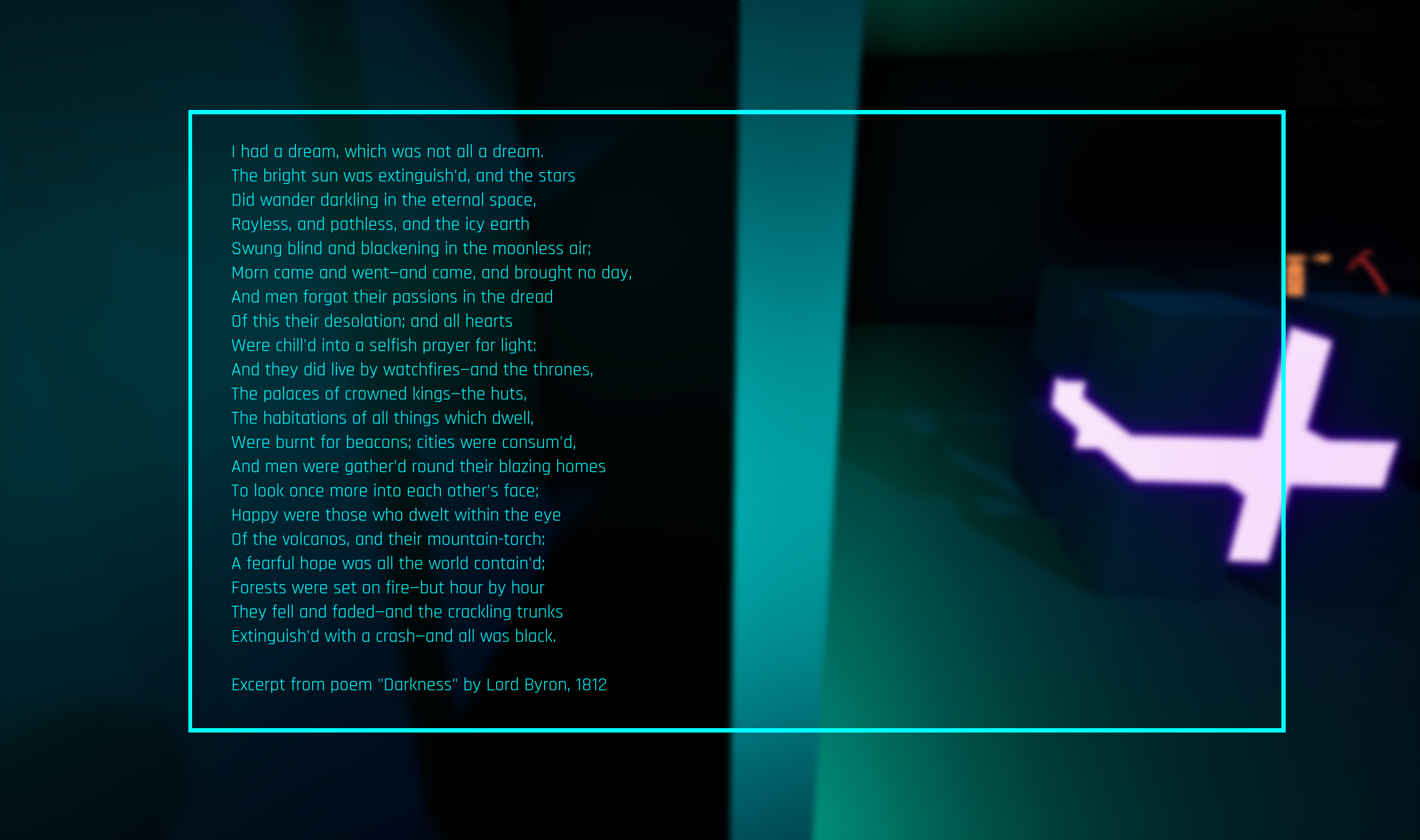 This poem was written in 1812, the infamous "Year Without a Summer", describing a similar climate crisis as the 536 AD event that wreaked havoc across the globe. This datapoint largely serves the same purpose as the previous one, providing insight into the harsh realities of the world the player now finds themselves in.