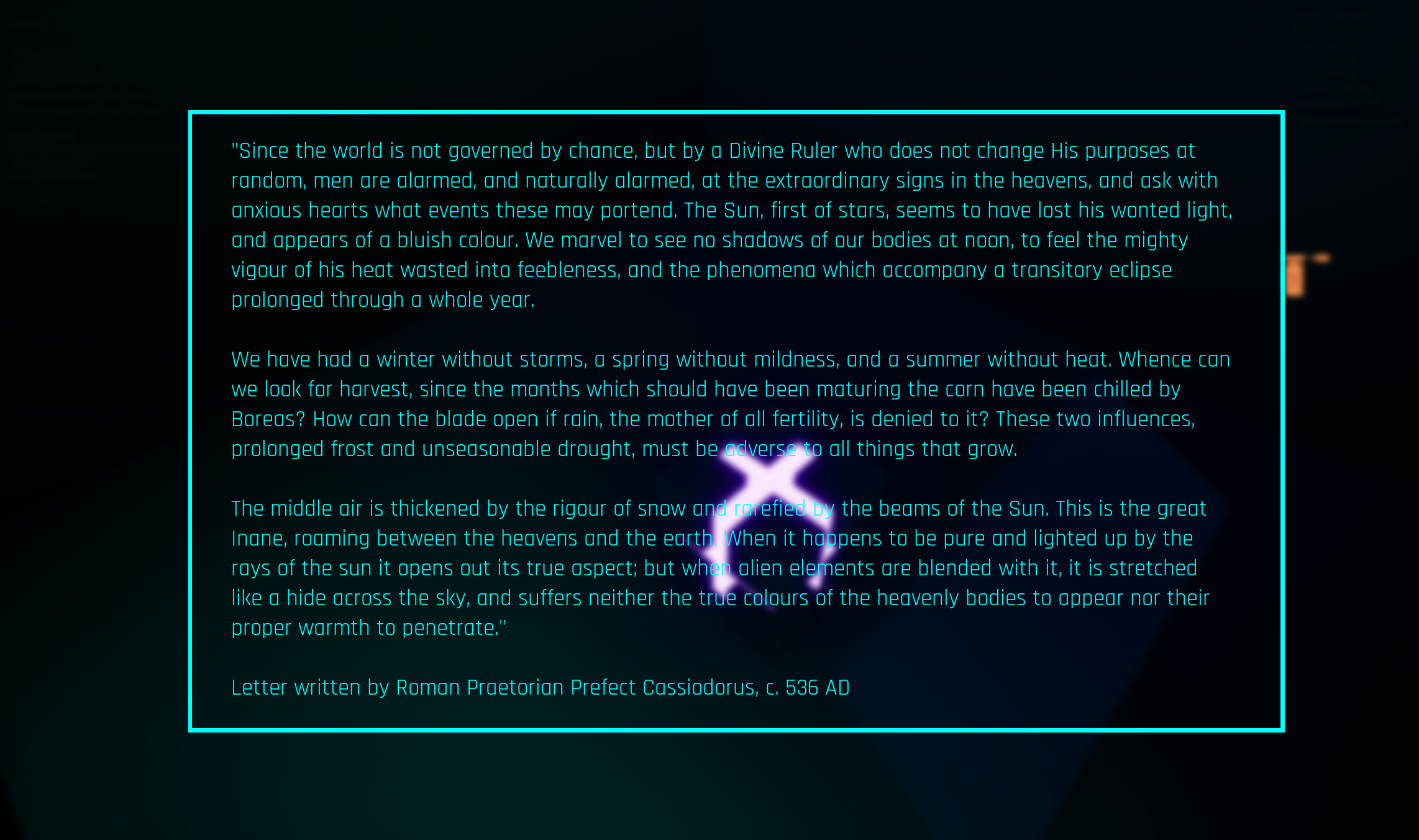 This datapoint is an excerpt from the letters of Roman statesman Cassiodorus, describing the volcanic winter that began in 536 AD. This event devastated the Northern Hemisphere, triggering widespread crop failures and mass death from the resulting famine and drop in temperatures. I included this partly as interesting historical detail but also to imply that the game's setting is essentially a more severe example of this taking place in the future.