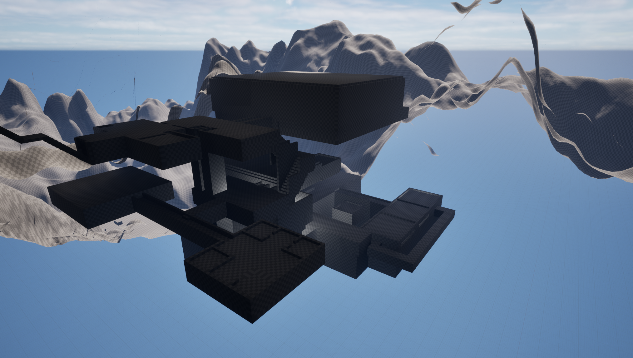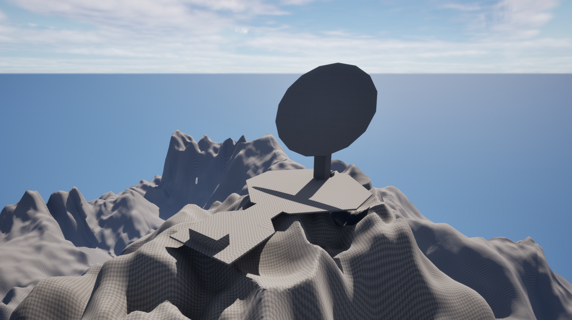 Early greybox for the mountain landscape and satellite dish