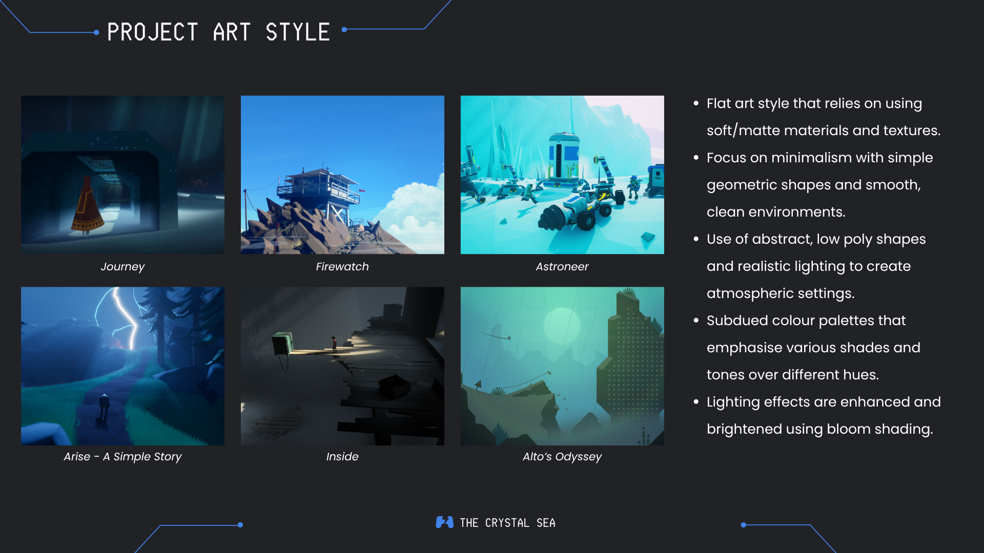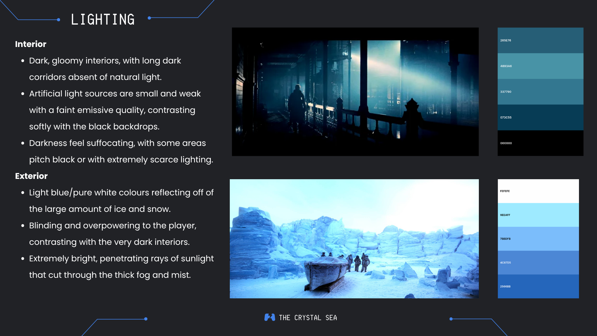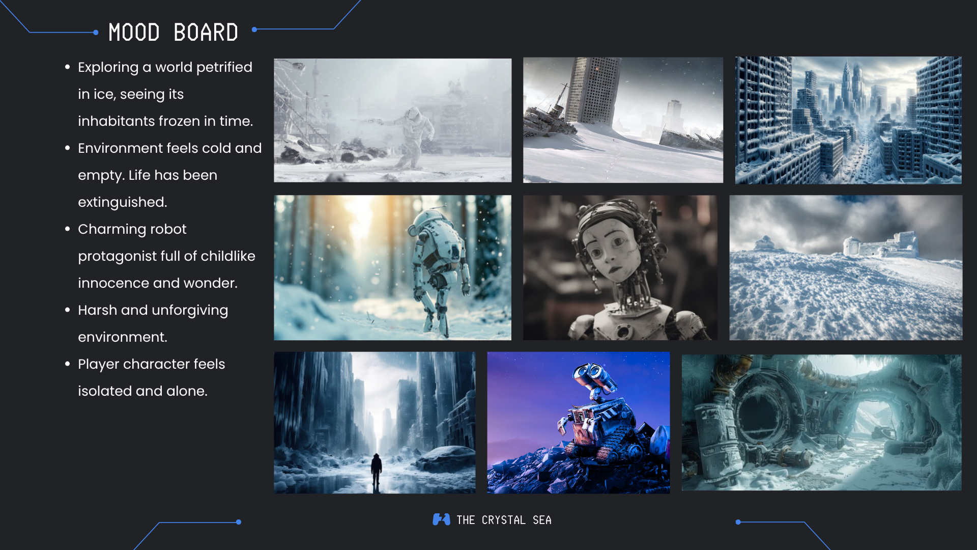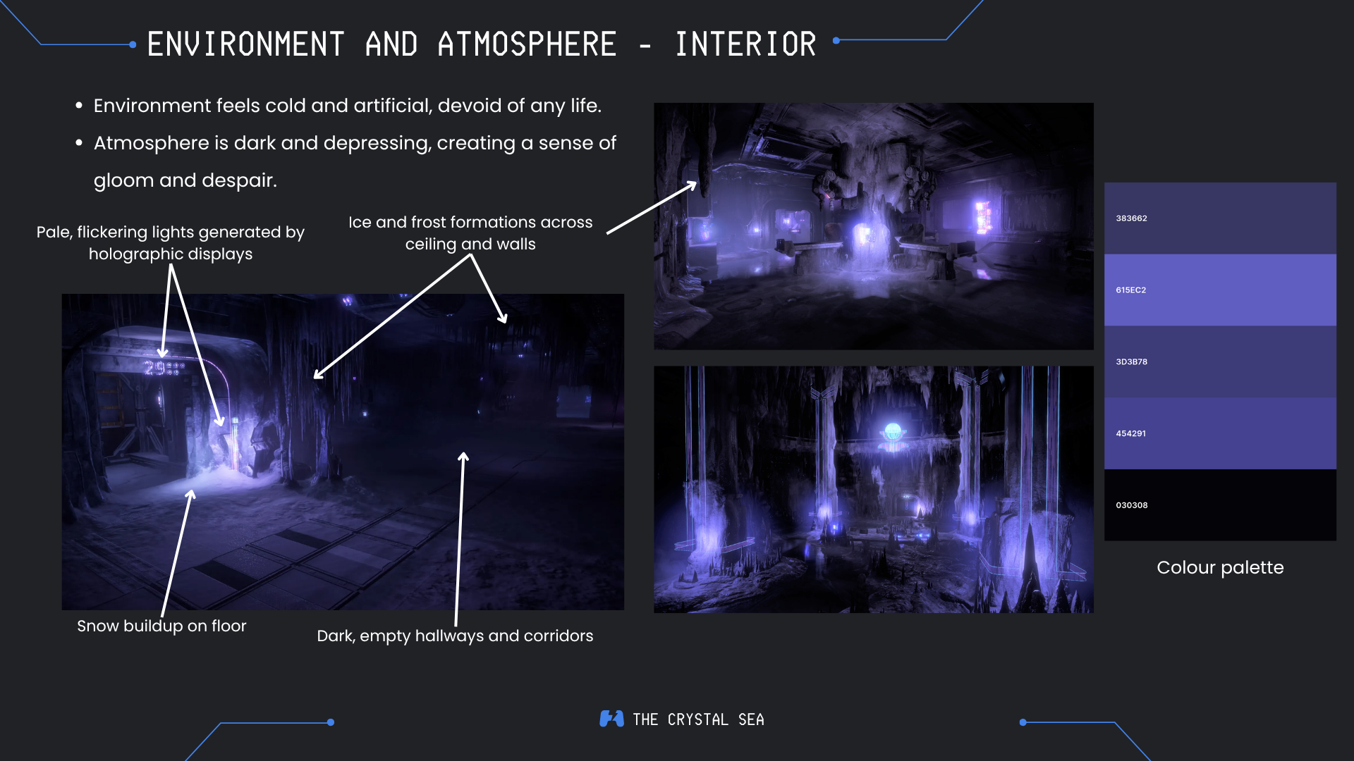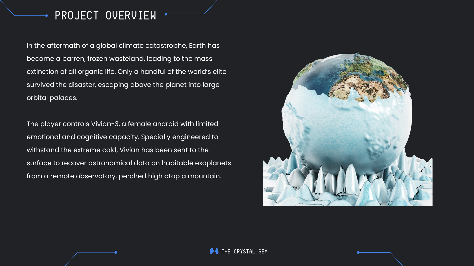 The Crystal Sea is a short walking simulator focused on atmospheric storytelling and simple environmental puzzles. The game takes place in the aftermath of a devastating global winter that has reduced the Earth to a barren, frozen wasteland. Only a handful of humans survived the disaster, living inside a luxury space station suspended in orbit above the planet.