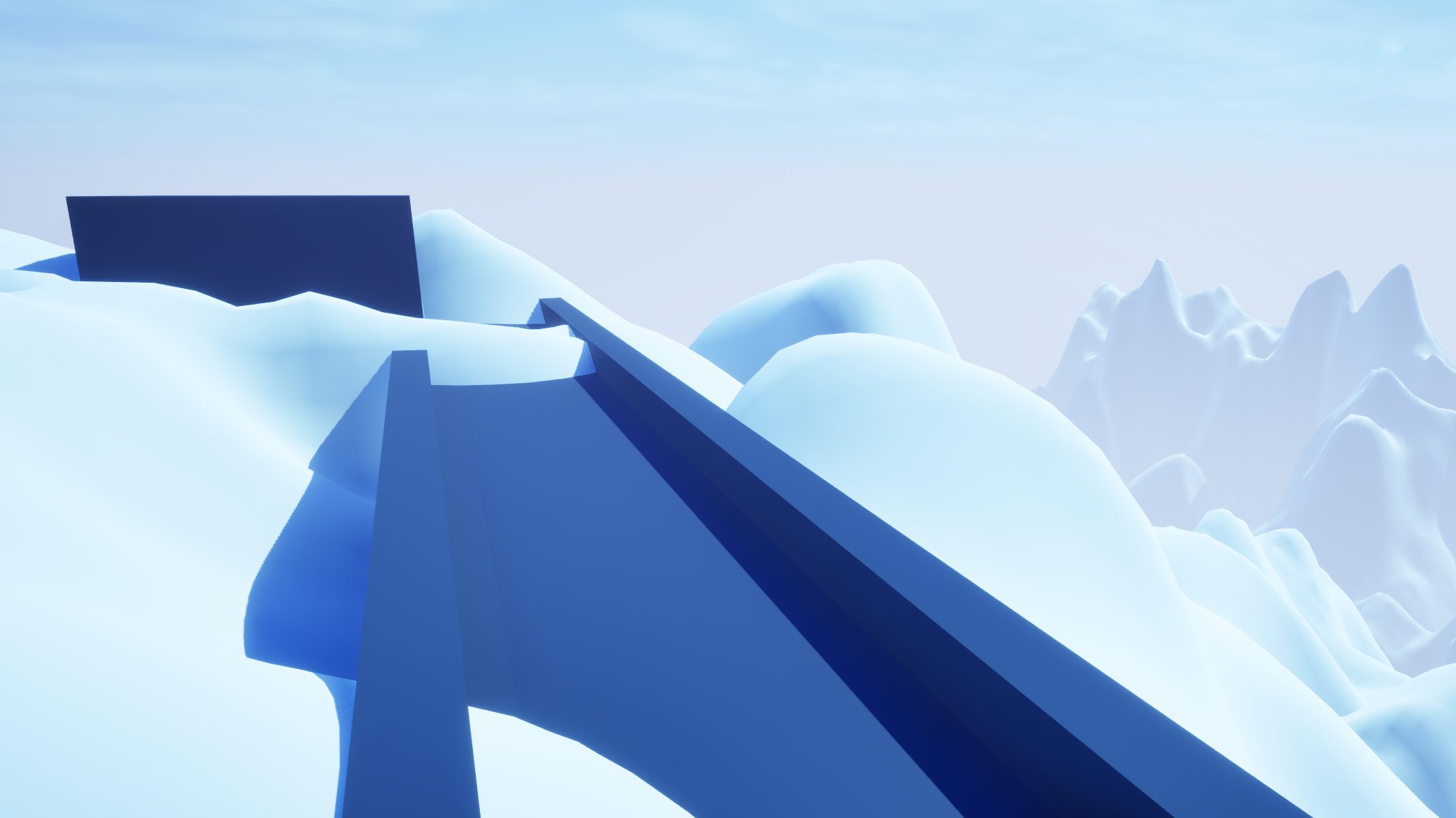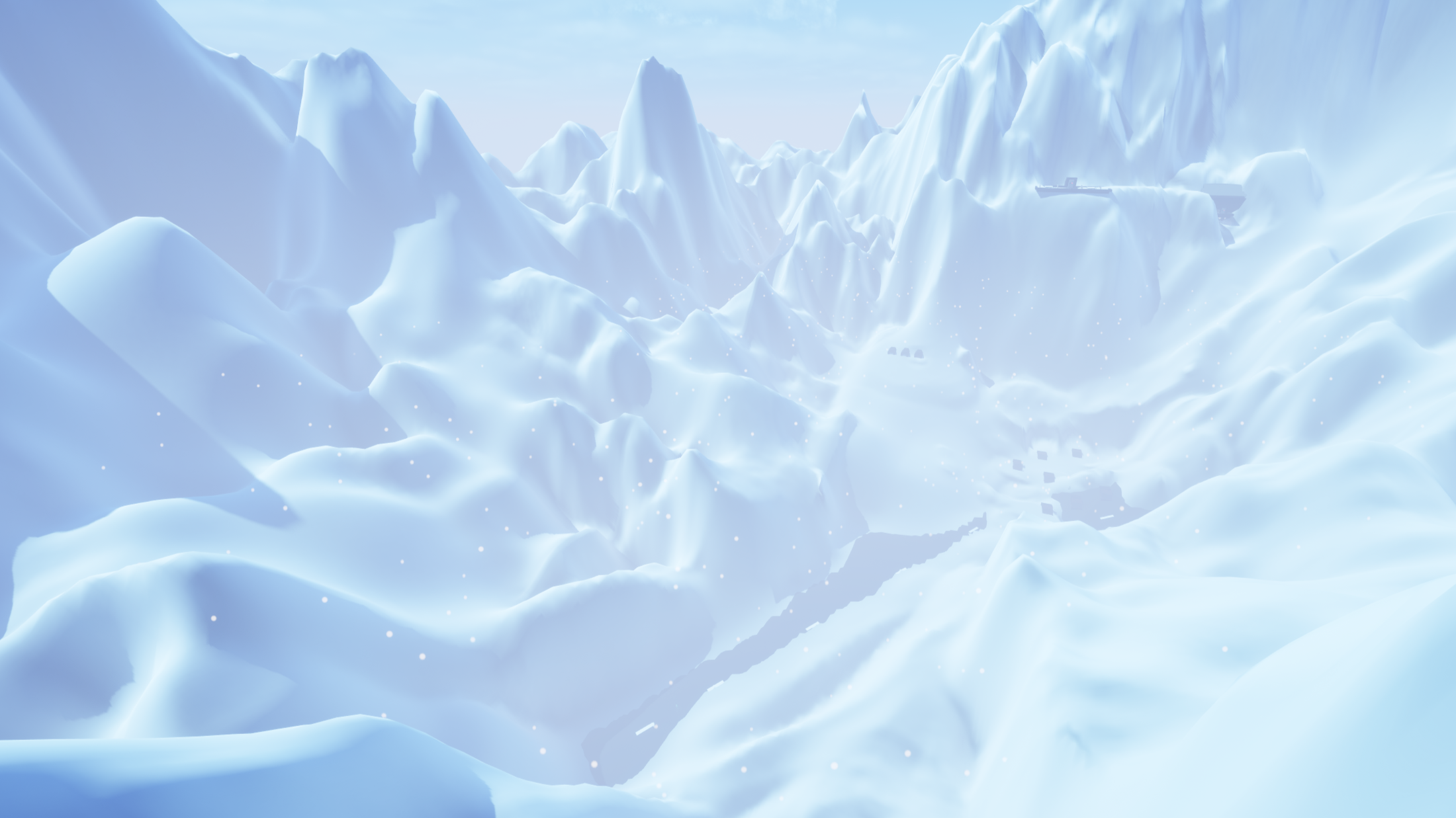 The other issue with environmental design was the snowfall effect. Initially the snow particle effect I created with Niagara was used to envelop the entire landscape, but this badly affected performance due to the sheer volume of particles. I wanted the level to have an intense blizzard affect to stress the harshness of the climate catastrophe, so I couldn't reduce the volume of snow particles.