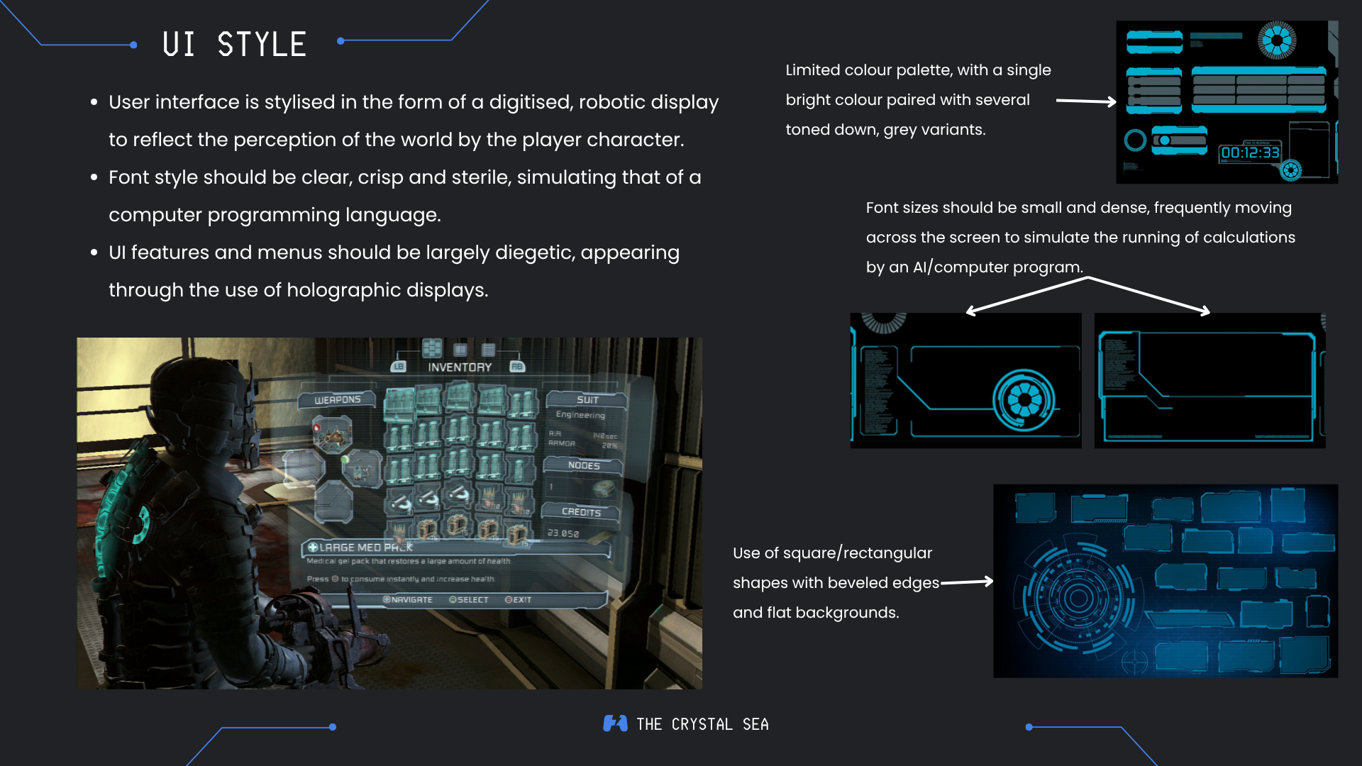This is an excerpt from the Book of Revelations, which provides the source for the game's title ("there was a sea of glass like unto crystal"). I chose this name as a reference to the sea of ice crystals that now enveloped the globe, but through this Bible verse it was also intended to invoke ideas of hubris. The survivors on the Golden Seraph (itself another Biblical reference to the highest order of angels), were attempting to transcend their human condition, living outside the bounds of the earth in artificial confinement, attempting to cheat death and overcome their mortality.