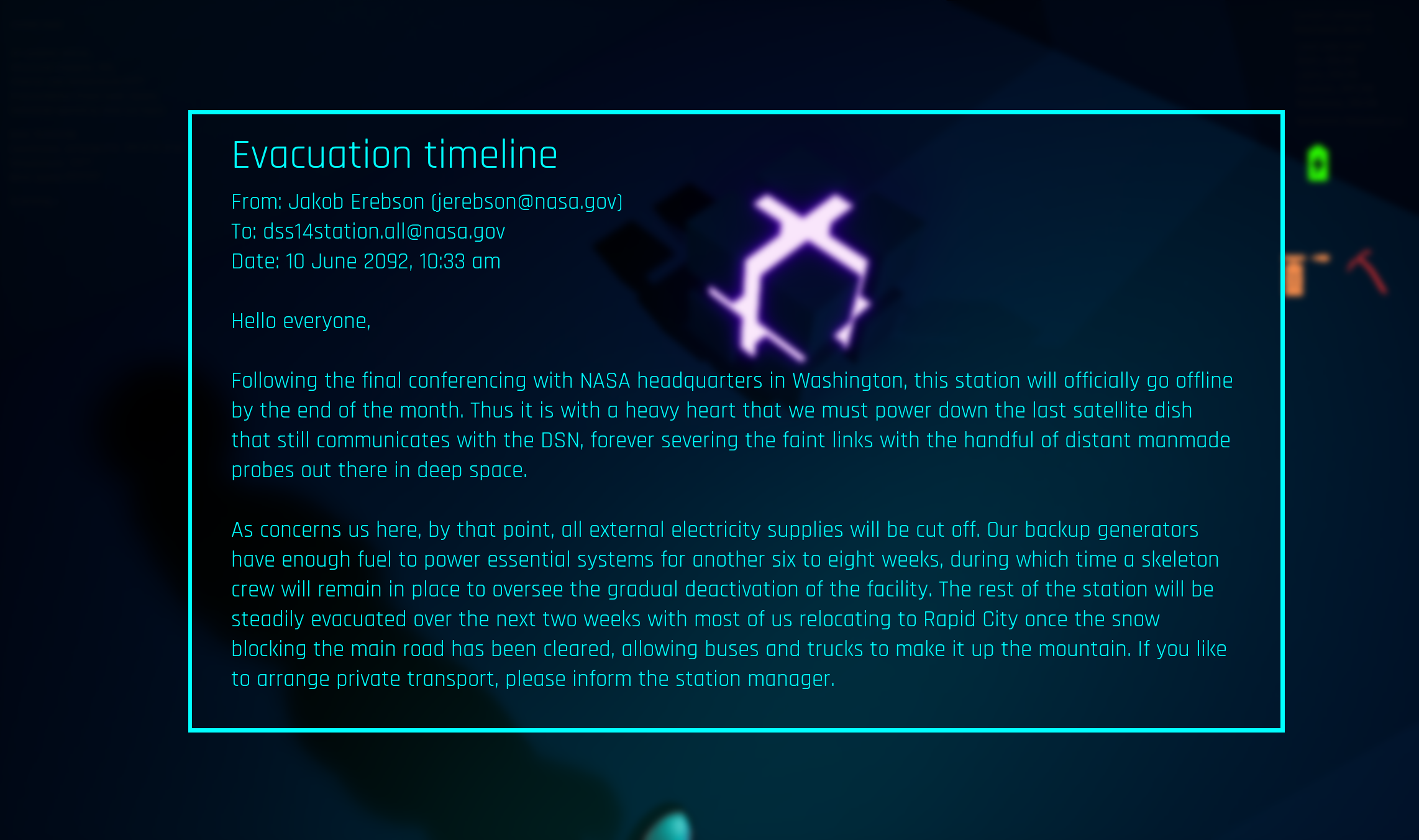 This datapoint was designed to offer context regarding the facility itself, identifying it as a deep space research station for NASA. It also provides insight on the crisis faced by the station's inhabitants: with the extreme drop in temperature, life inside the facility had become impossible and they were being forced to evacuate. The facility's location is also revealed to be South Dakota by the namedrop of Rapid City, and the reference to abundant snowfall despite the email being dated to mid June (summertime in the Northern Hemisphere), reveals how severe the climate crisis has become.