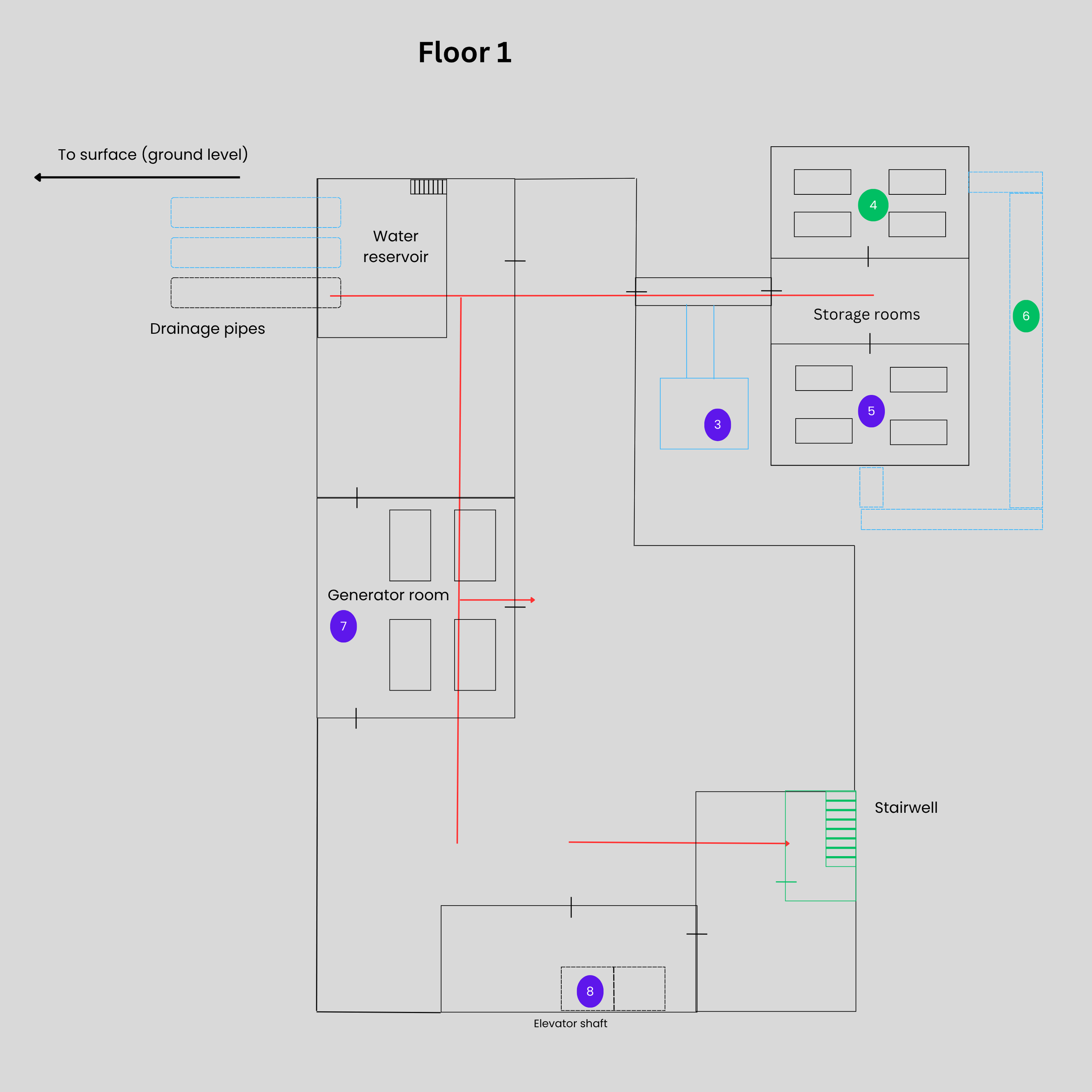 • Player enters Floor 1 through drainage pipe and drops down into the water reservoir basin.