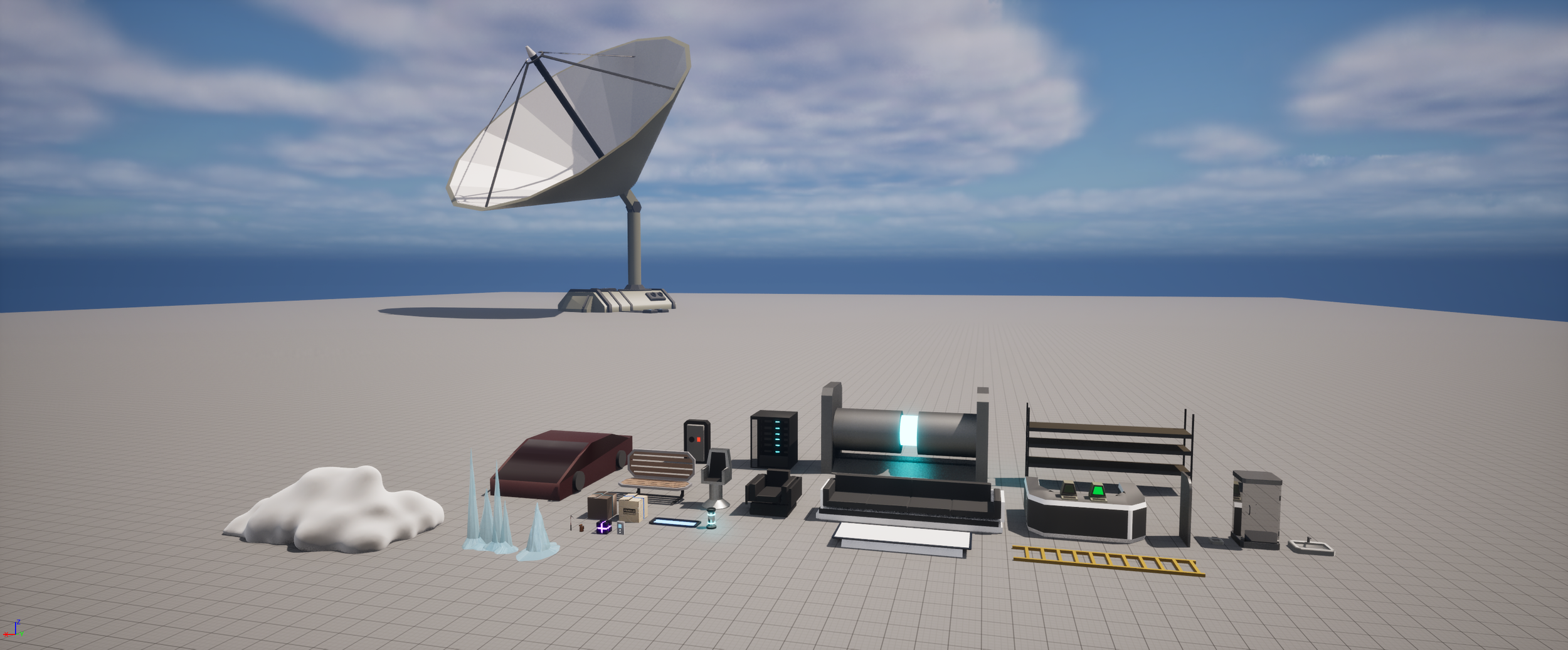 I blocked out about two dozen different meshes in a few days. These included the satellite (arm, dish and base), ice axe and blowtorch, light fixtures, snow and ice formations, power cell and generator, various indoor furniture, a futuristic vehicle model, computer terminals, and various bathroom utilities (including shower, sink and toilet bowl).