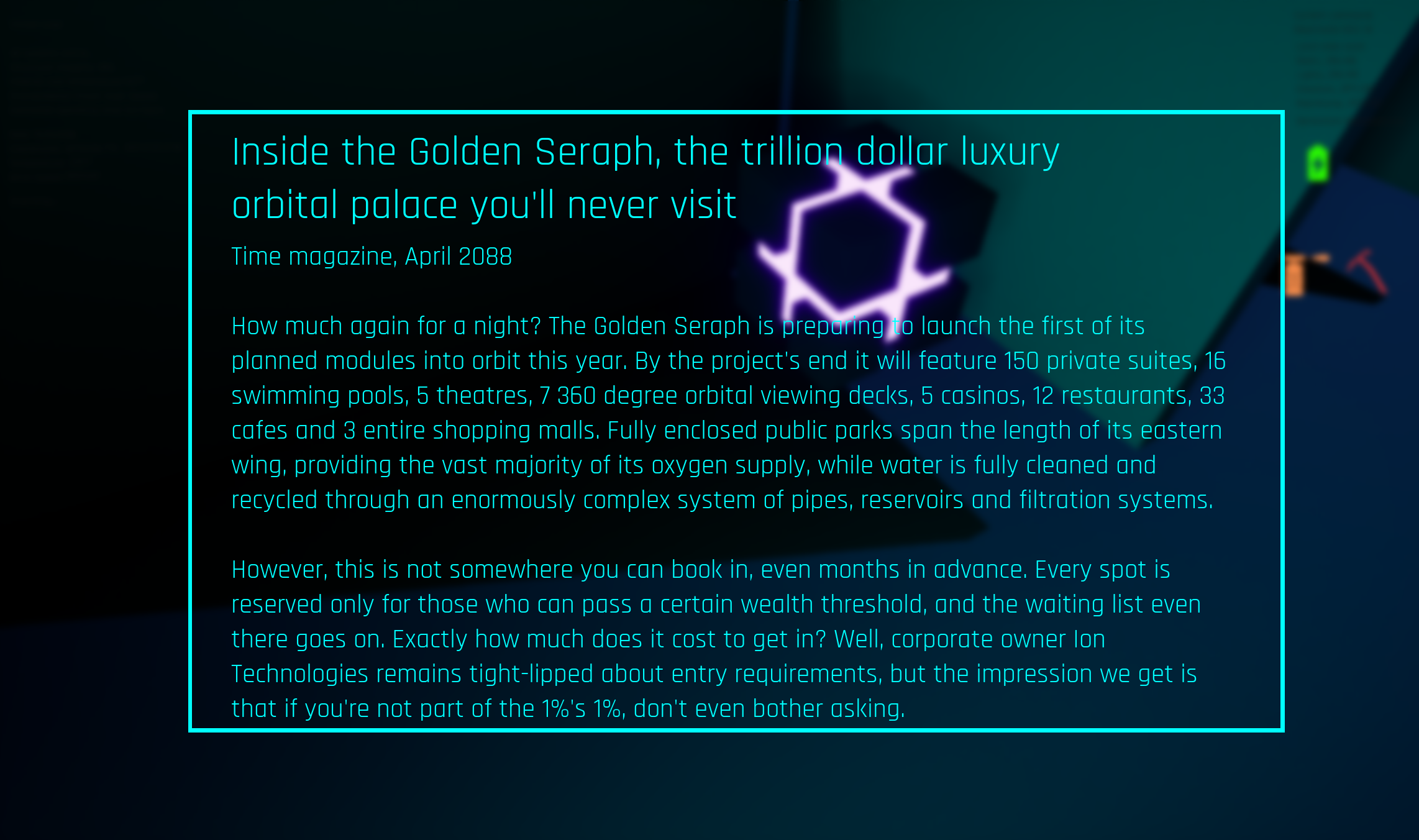 This datapoint was written as a news report about the opening of an luxury space station for the ultrawealthy. It is located in a hidden area, so the player will need to explore thoroughly to find it, and they are rewarded for this as it contains valuable story information. The report is dated to April 2088, so the player knows it predates the climate collapse. It is meant to provide a small glimpse into society before the global winter, but more importantly to explain where the current human survivors came from - they are revealed to be the same wealthy elite that avoided perishing from the cold due to their habitation on the Golden Seraph resort.