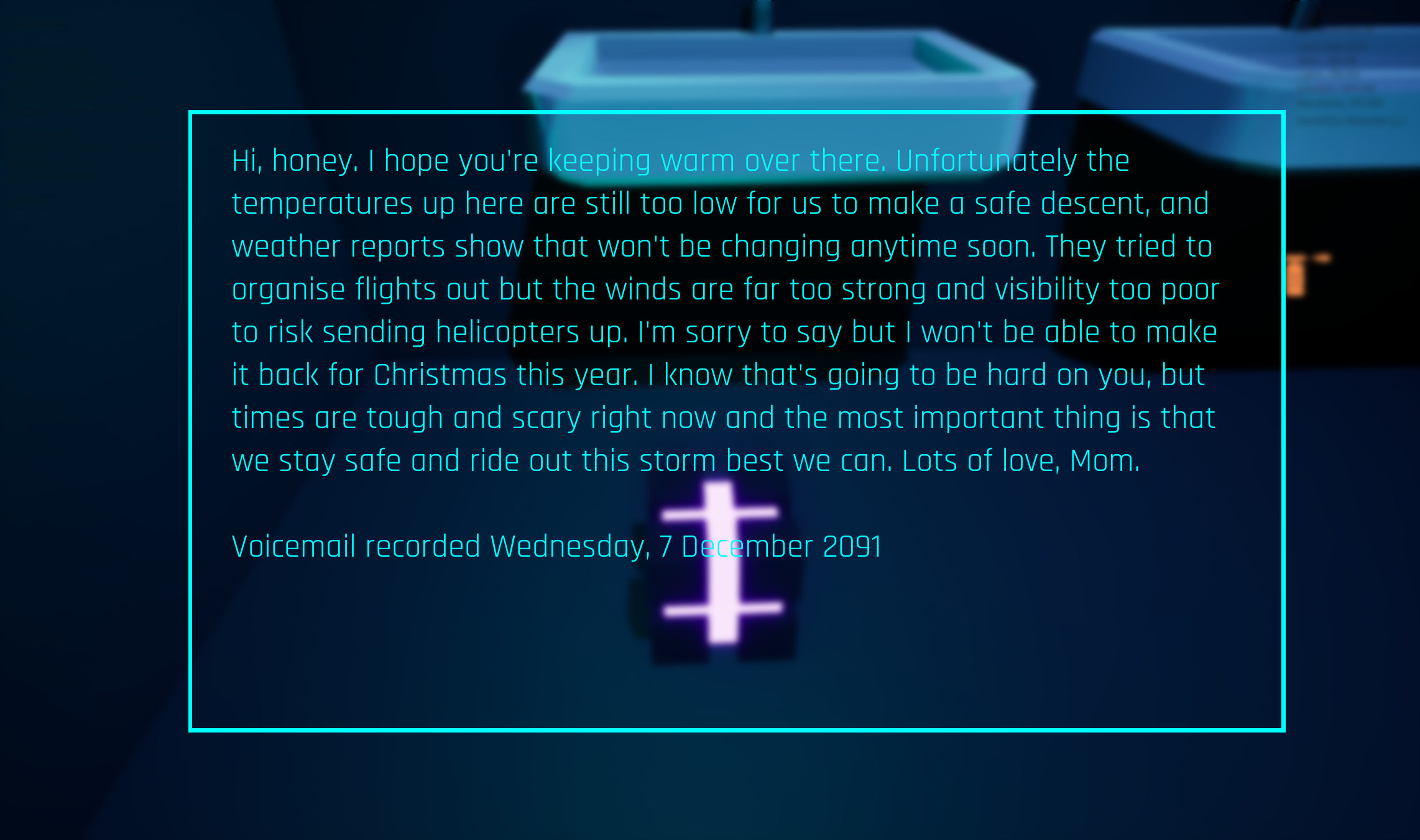 "Hi, honey. I hope you're keeping warm over there. Unfortunately the temperatures up here are still too low for us to make a safe descent, and weather reports show that won't be changing anytime soon. They tried to organise flights out but the winds are far too strong and visibility too poor to risk sending helicopters up. I'm sorry to say but I won't be able to make it back for Christmas this year. I know that's going to be hard on you, but times are tough and scary right now and the most important thing is that we stay safe and ride out this storm best we can. Lots of love, Mom."