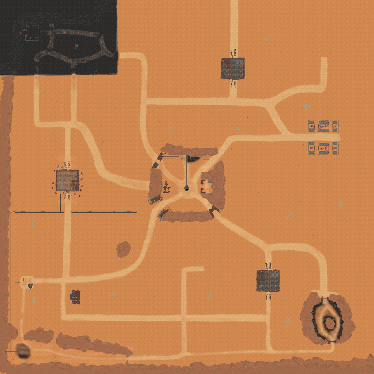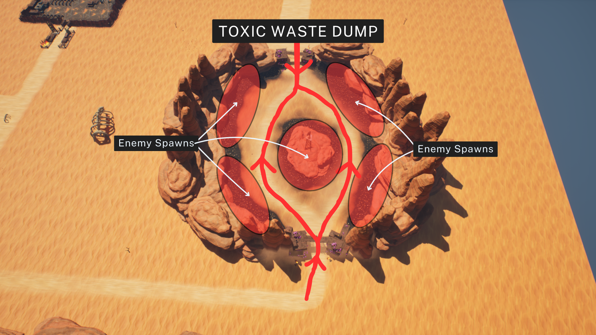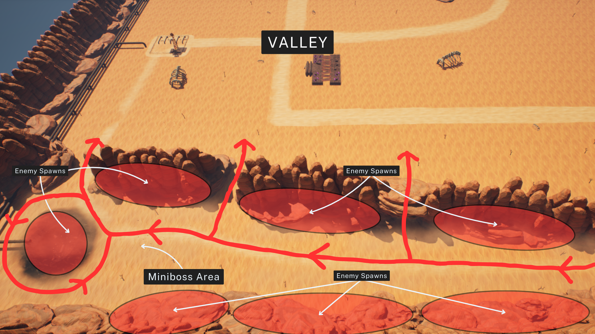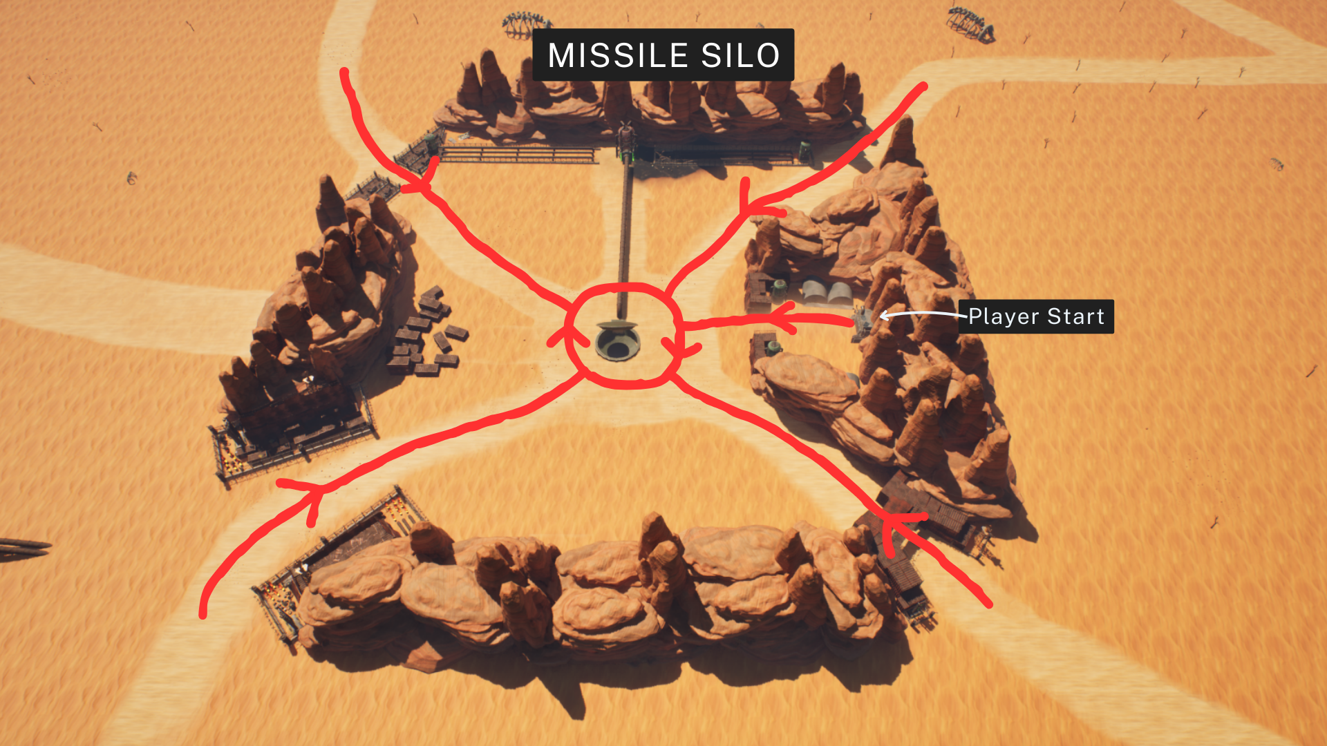 The navigable terrain consists of a elliptical track that allows the player to continously loop around the centre rock formation as they fend off enemies, with two entry/exit points at the north and south ends for the player to escape through.