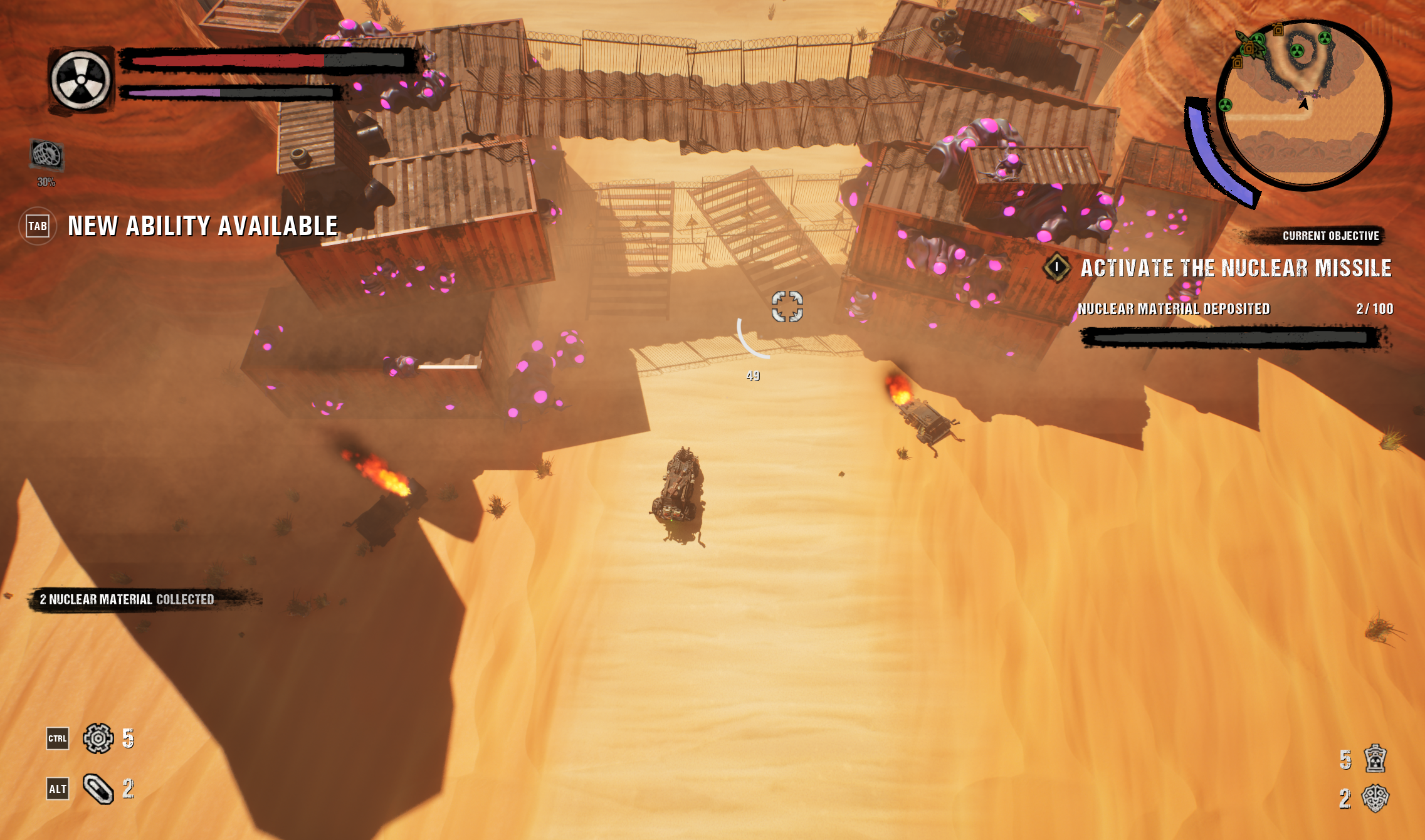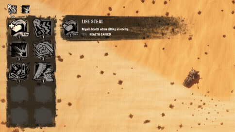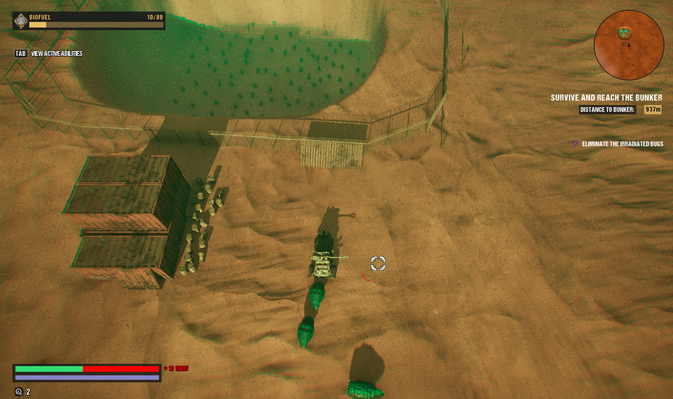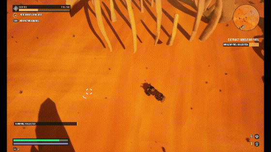 To survive in the desert, you must keep your vehicle powered with biofuel, a crude resource harvested from the remains of slain bugs. Infusing your vehicle with enough biofuel unlocks powerful abilities that enhance driving and combat, allowing you to venture into more dangerous areas and tackle deadlier enemies.