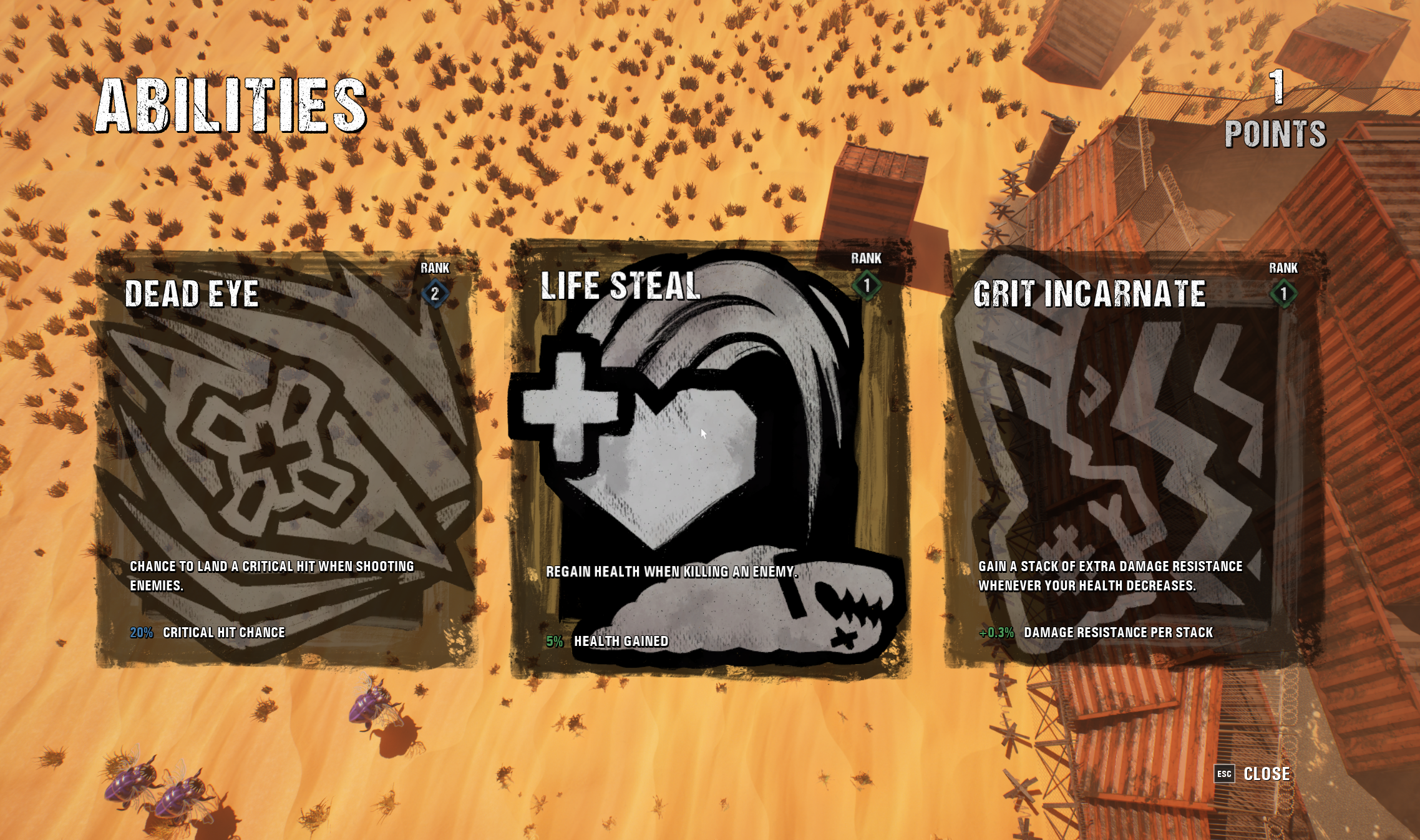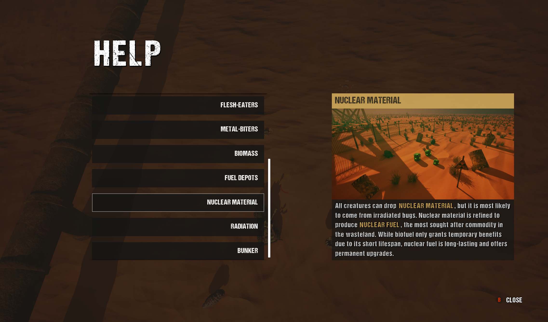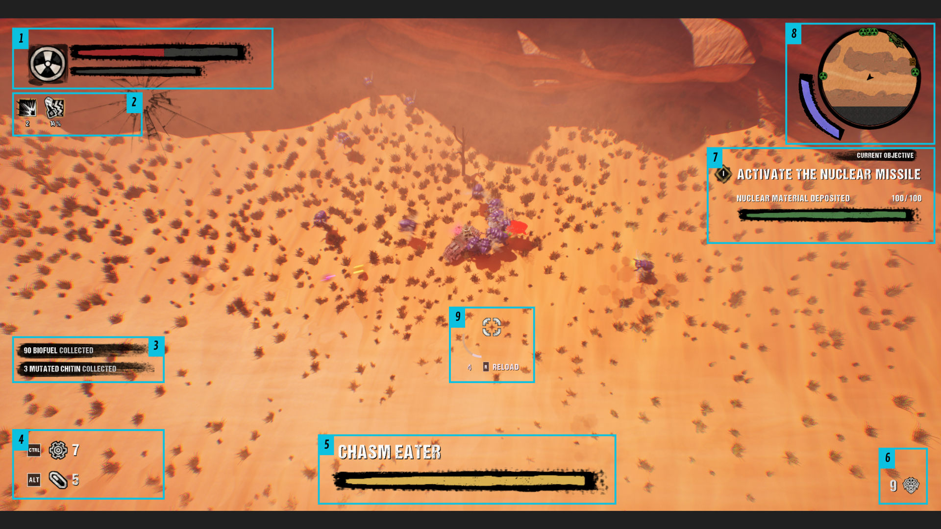 To survive in the desert, you must keep your vehicle powered with biofuel, a crude resource harvested from the remains of slain bugs. Infusing your vehicle with enough biofuel unlocks powerful abilities that enhance driving and combat, allowing you to venture into more dangerous areas and tackle deadlier enemies.