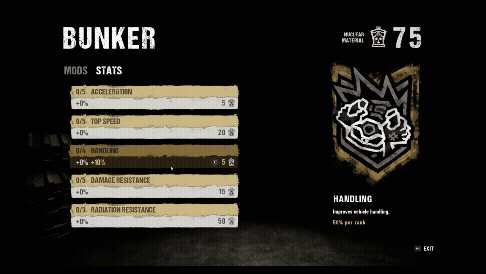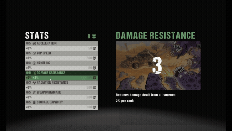 The first is stat upgrades, which provide incremental improvements to core vehicle attributes, which are central to any build the player might put together. These consisted of: