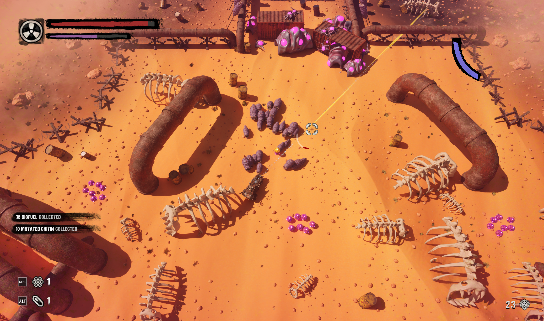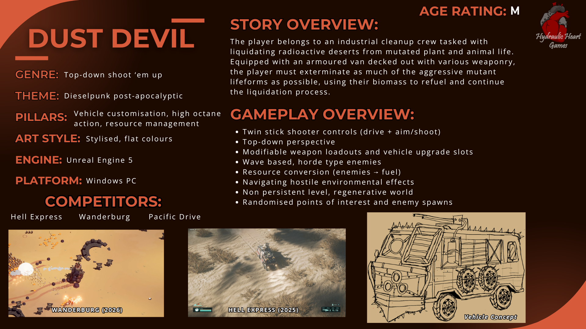 Gameplay wise, I originally conceived Dust Devil as a hybrid twin-stick shooter that alternated between being inside a vehicle and being on foot, however we felt that this was over scoped given the time we had, effectively needing to build two gameplay systems instead of one. With this feedback we reworked the concept so it would focus purely on vehicle gameplay, with the core loop revolving around using biofuel harvested from hostile wildlife to power the vehicle - essentially converting enemies into resources.