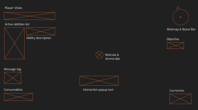For this reason, I aimed to combine widgets in ways that would reduce their screen presence, such as using a radial slider for the boost bar and wrapping it around the minimap. Similarly, ammo bars wrap around the reticule and follow the player cursor, so players will immediately notice important information such as low ammo warnings.