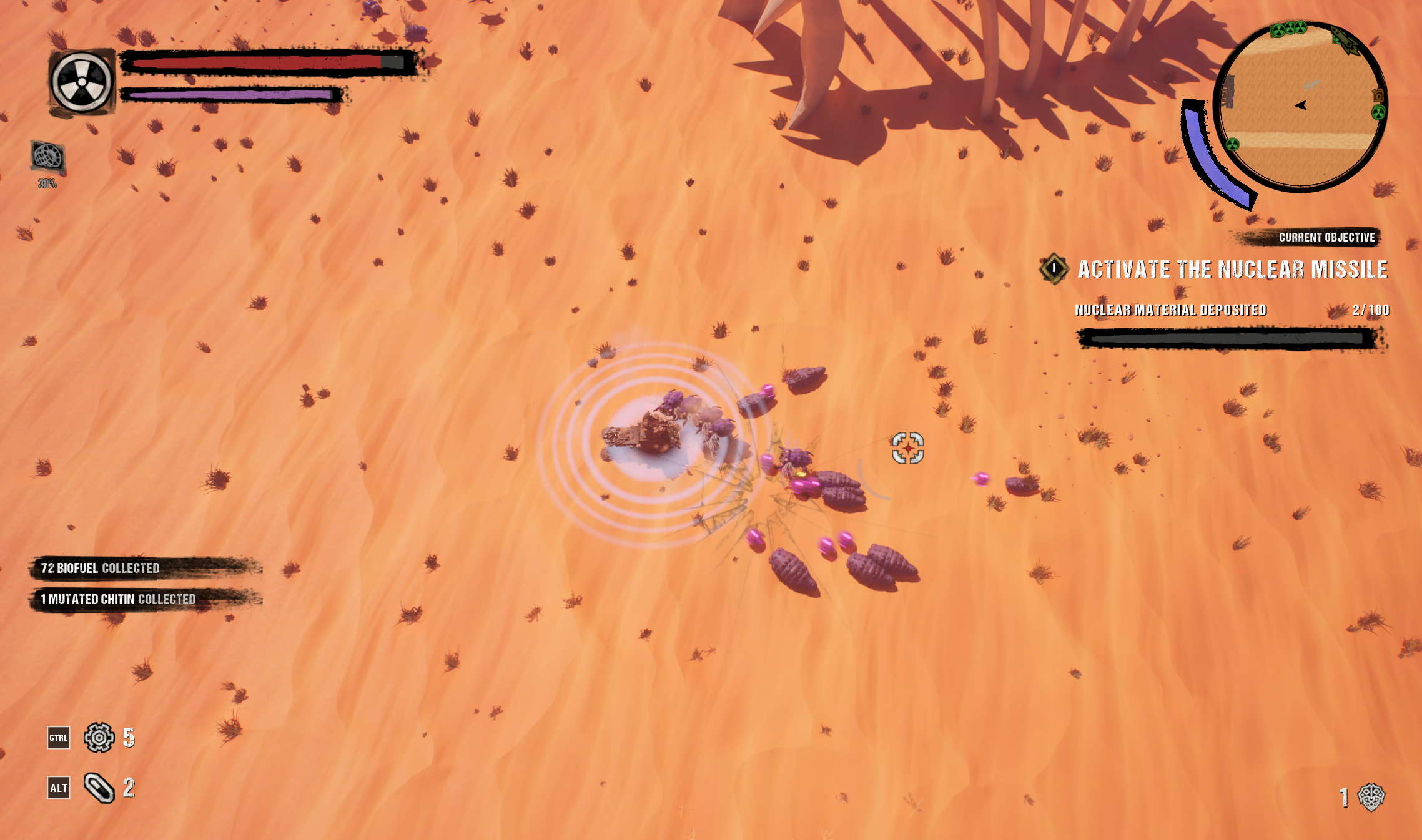 This also conflicted with one of our original design pillars - converting enemies into resources. The more bugs you eliminate, the more biofuel you produce, and thus the stronger you become. We wanted players to be cleaving their way through swarms while getting swamped from all sides, fighting until the bitter end - not forced to flee because they felt weak and defenceless.