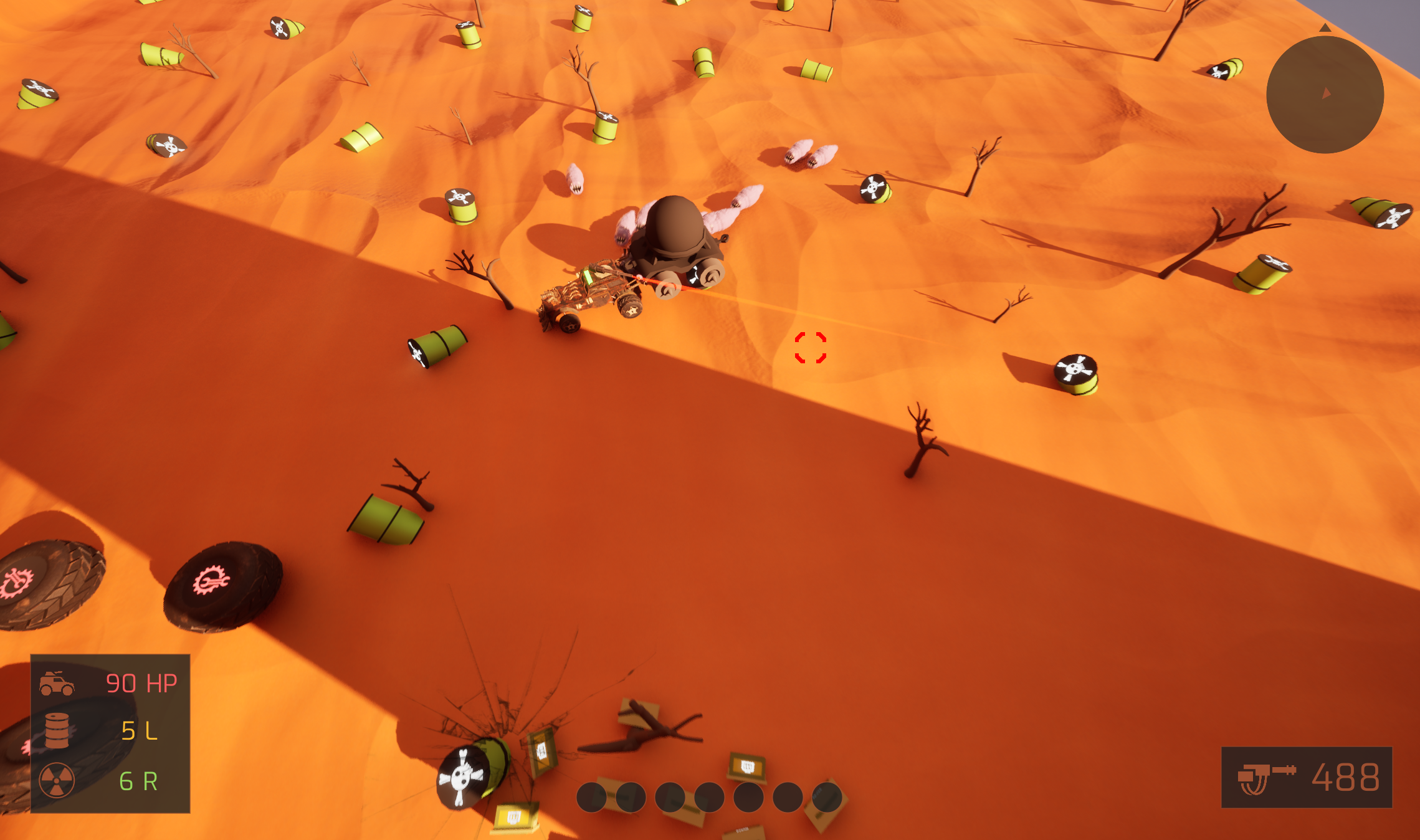 From here we settled on the idea of creating an action rogue-lite, as we wanted to incorporate systems for both temporary and permanent player progression. The game world would be designed as a hostile, dangerous environment that the player could not survive in for long, but would be filled with precious resources that could be used to permanently upgrade their vehicle. This allowed the player to gradually grow stronger and more resilient over time - able to survive longer during each expedition into the desert.