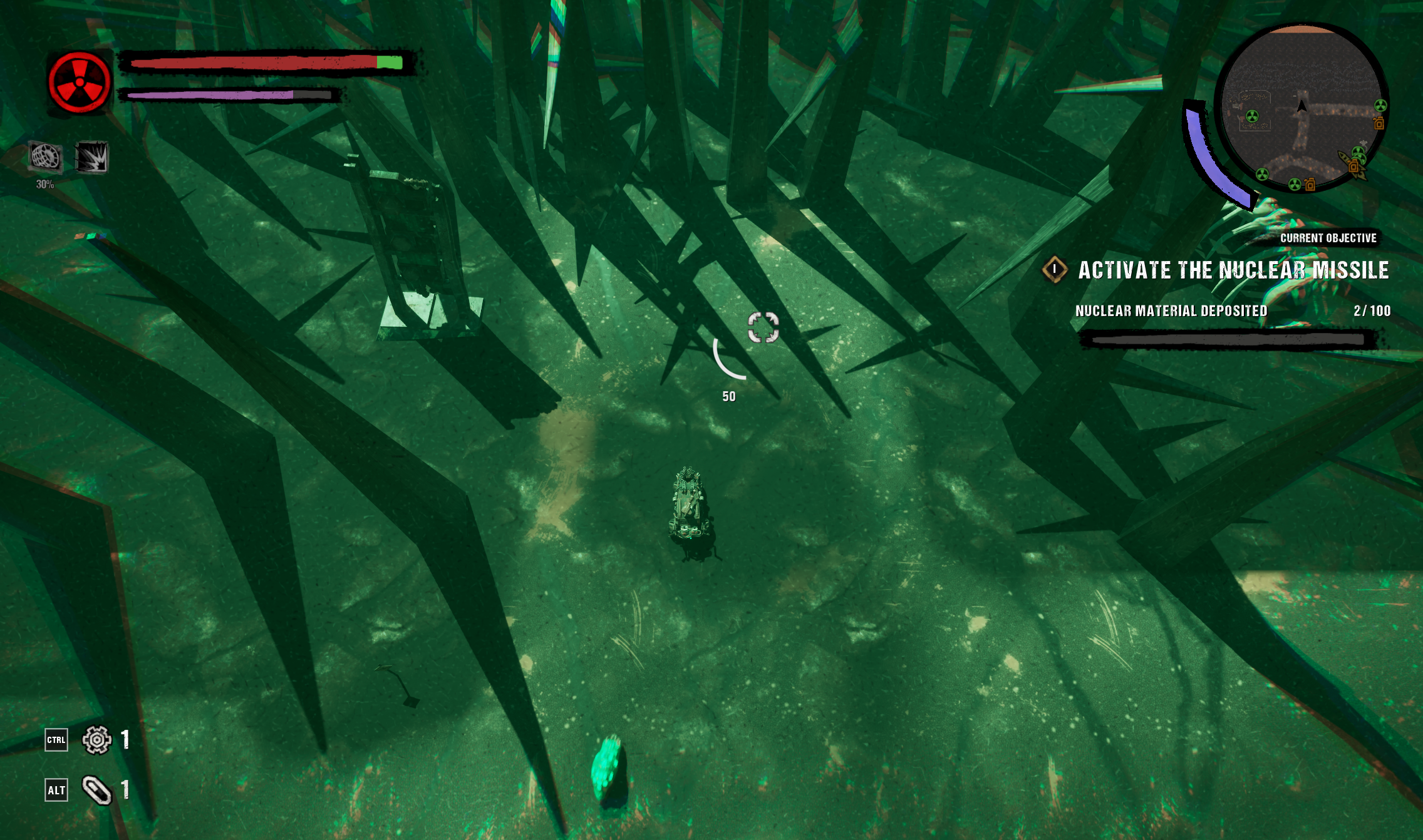 By contrast, the spike field flips this on its head, introducing the player to a landscape rife with obstacles, causing frequent collisions, which adds to their panic as they try to escape quickly before they are overwhelmed with radiation.