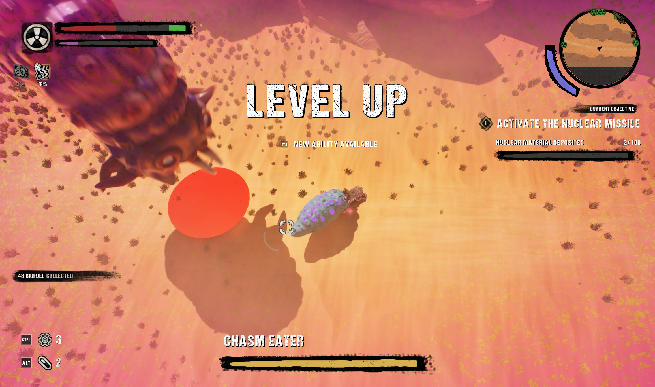 For the second issue, we had biofuel convert instantly to XP when collected, allowing players to level up as soon as they passed the next threshold. Opening the ability selection screen could now be done anywhere and temporarily paused the game until the player exited the menu.