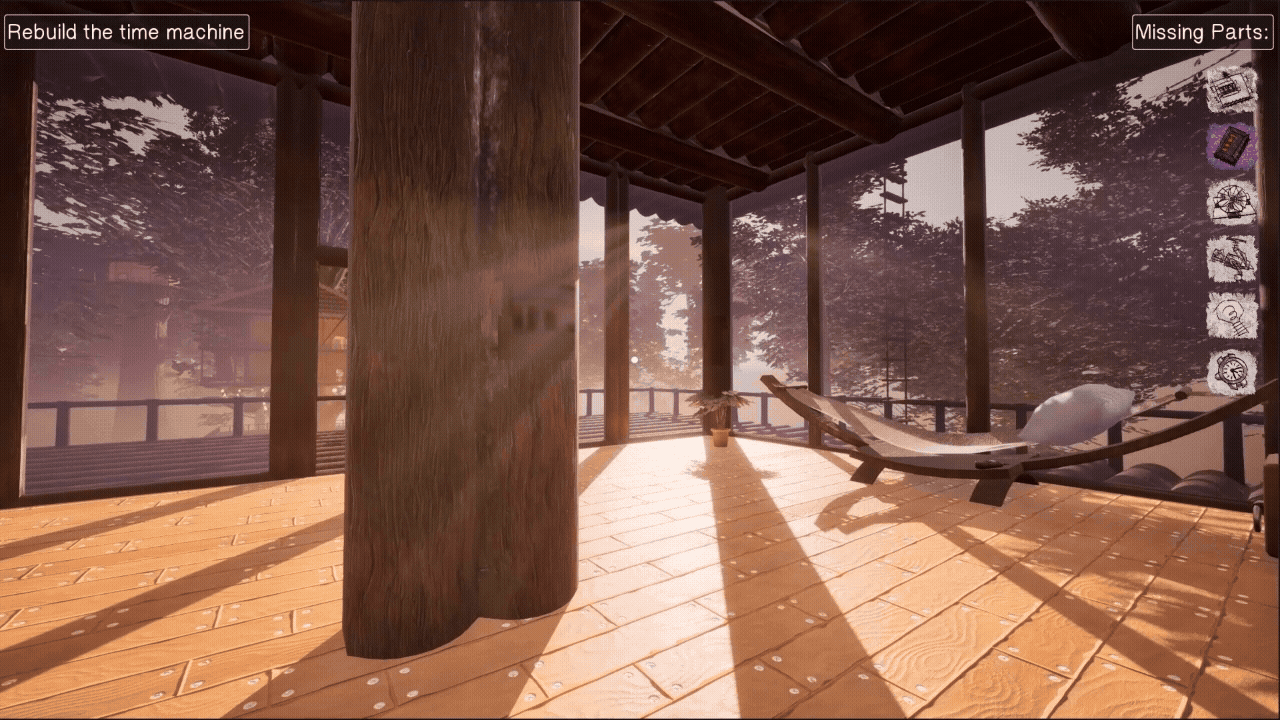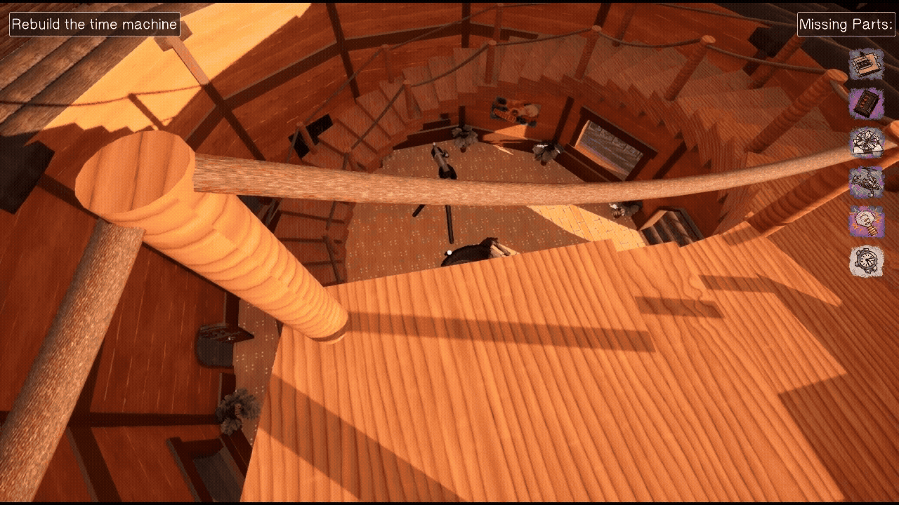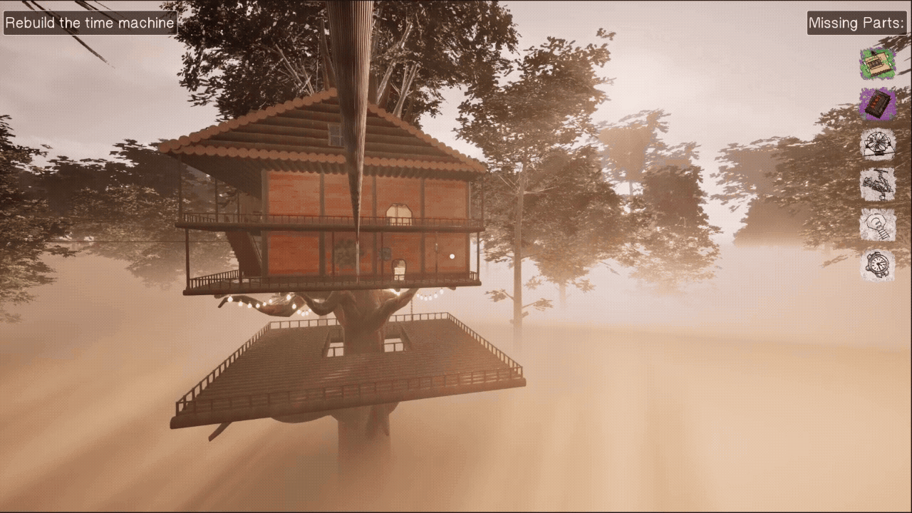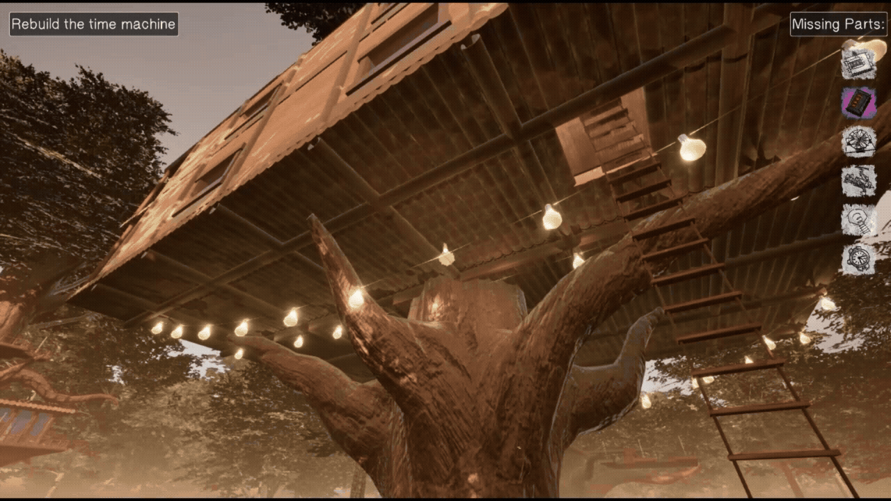 To fully reconstruct the memory, you must locate the missing components for William's time machine, hidden throughout the treehouse complex. Each component is contained within 2D decals painted onto the environment, and when viewed from the right angle, they will transform into a 3D object that can be installed into the time machine.