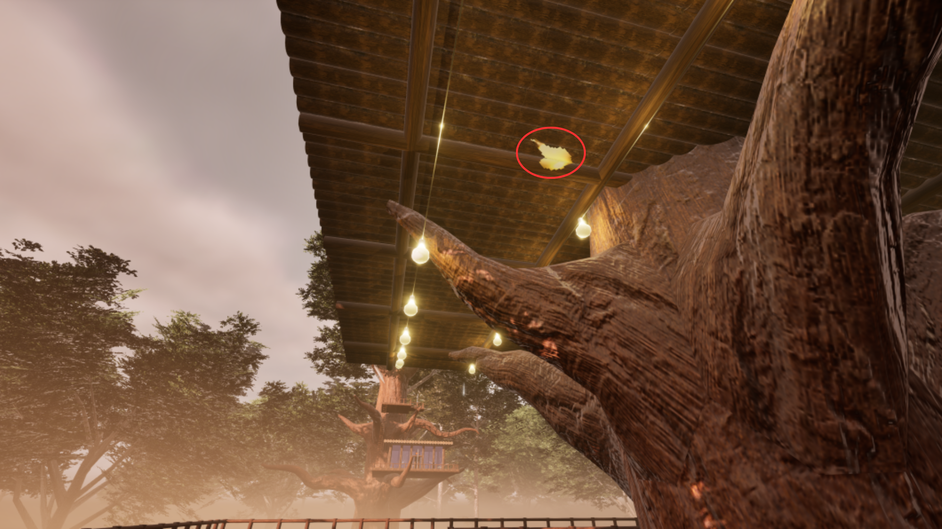 First I added a string of identical light bulbs suspended below the treehouse, so the player would immediately draw a connection with the missing light bulb component.