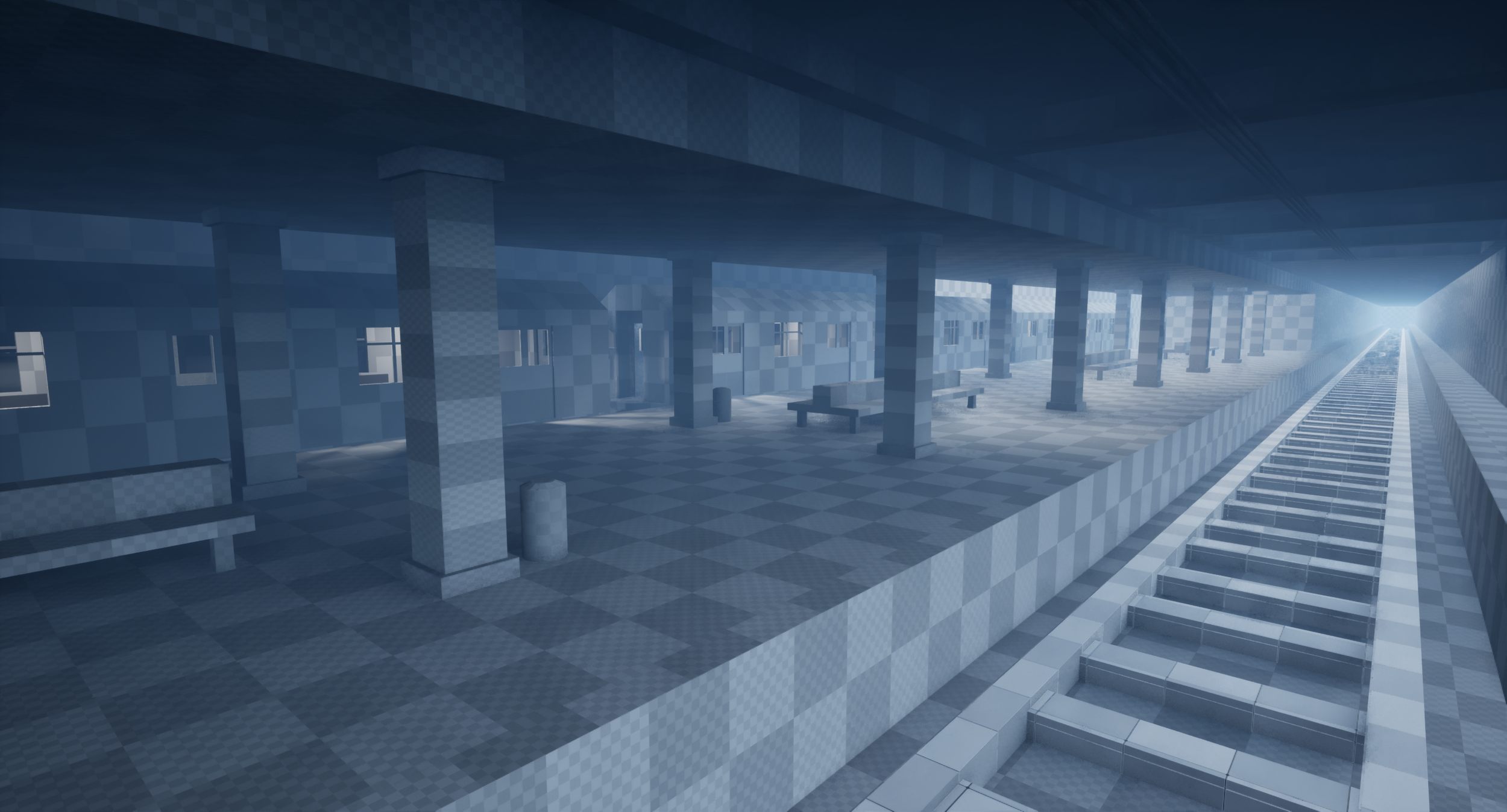 I began with greyboxing the main level, starting with the subway station before moving onto the train car itself. Once this was done I tackled the modelling of basic environmental props, including the rail tracks, utility lights, signs, benches, stairs, and the train doors.